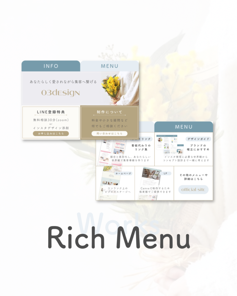 【制作実績】制作物:切り替えリッチメニュー(03design)ツール:Canva期間:1日